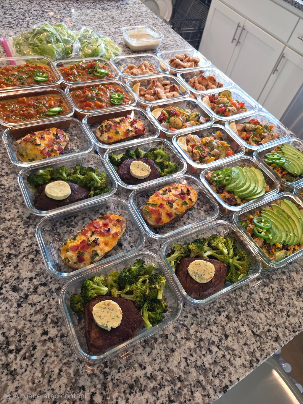 Complete entrées with sides and sauces, portioned and stored neatly for the week ahead.